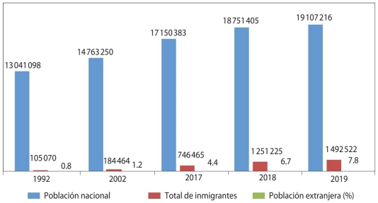 Chile registra un aumento de su población migrante entre 1992 y 2019 de siete puntos porcentuales, pasando de 0.8 por ciento sobre el total de la población nacional a 7.8 por ciento, correspondiente a 1 492 522 personas (gráfica 1). Este crecimiento se concentra en la última década cuando ingresó 82 por ciento del total de los migrantes, y solo durante los años 2018 y 2019 50 por ciento de esta población llegó al país (gráfica 2).