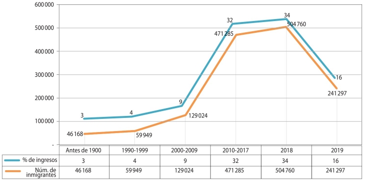El punto de inflexión en el aumento de los flujos migratorios se produce desde el segundo semestre de 2019. Específicamente, al comparar los ingresos de las personas migrantes de ese año en relación con 2018, estos bajaron en 12 por ciento, y los ingresos de 2020 comparados con 2019 también disminuyeron en 66 por ciento (SJM, 2020).