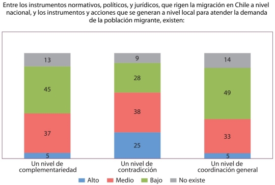 El quinto aspecto al que conducen los resultados de la encuesta es que entre los instrumentos en materia migratoria del gobierno central y los instrumentos de las municipalidades no solo existen bajos niveles de complementariedad y coordinación en general, sino que también se produce un alto nivel de contradicción (la gráfica 3 muestra el detalle de las respuestas).