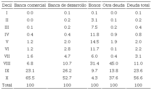 Visto desde la distribución de capacidades para generar recursos propios, es posible dimensionar que el mercado de la deuda municipal es profundamente desigual. Más de 56 por ciento de la deuda total municipal se concentra en los municipios que se ubican en el último decil (cuadro 1) de la distribución de ingresos propios por habitante; es decir, en los municipios con mayores niveles de ingresos públicos per cápita. Si distinguimos por tipo de deuda, 65.5 y 52.7 por ciento de la deuda municipal es con la banca comercial y la banca de desarrollo, respectivamente. Esta se concentra en el último decil de ingresos propios municipales per cápita. El mercado de bonos muestra una distribución menos concentra-da, aunque vale recordar que el peso de esta deuda en el saldo total es bajo.