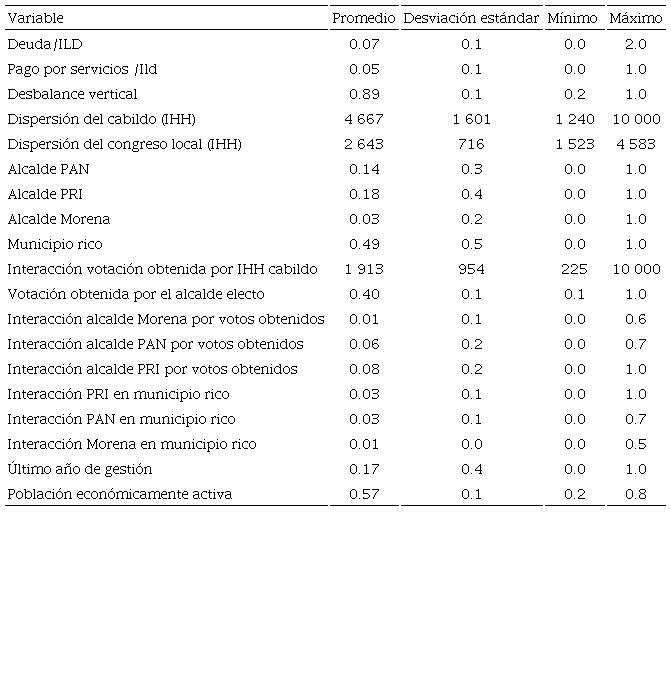 En promedio, durante el periodo analizado la deuda como proporción de los ingresos de libre disposición ascendió a 7 por ciento, alcanzando niveles máximos de alrededor de 200 por ciento, entre los municipios que forman parte de la muestra. En cuanto al pago por servicios de la deuda, esta ascendió a 5 por ciento, alcanzando niveles máximos de 100 por ciento de los ingresos de libre disposición. La concentración política promedio, medida a través del IHH, fue de 4 667 en el caso de los cabildos y de 2 643 para los congresos locales, observándose, en el caso de los cabildos, casos en los que un solo partido político o coalición concentra la totalidad de representantes (IHH = 10 000). El desbalance vertical en los municipios promedió 89 por ciento, cuyos niveles máximos dan cuenta de una total dependencia a las transferencias del gobierno central (100%). Por su parte, la población económicamente activa promedió 57 por ciento, con niveles mínimos cercanos a 20 por ciento y máximos alrededor de 80 por ciento de la población.