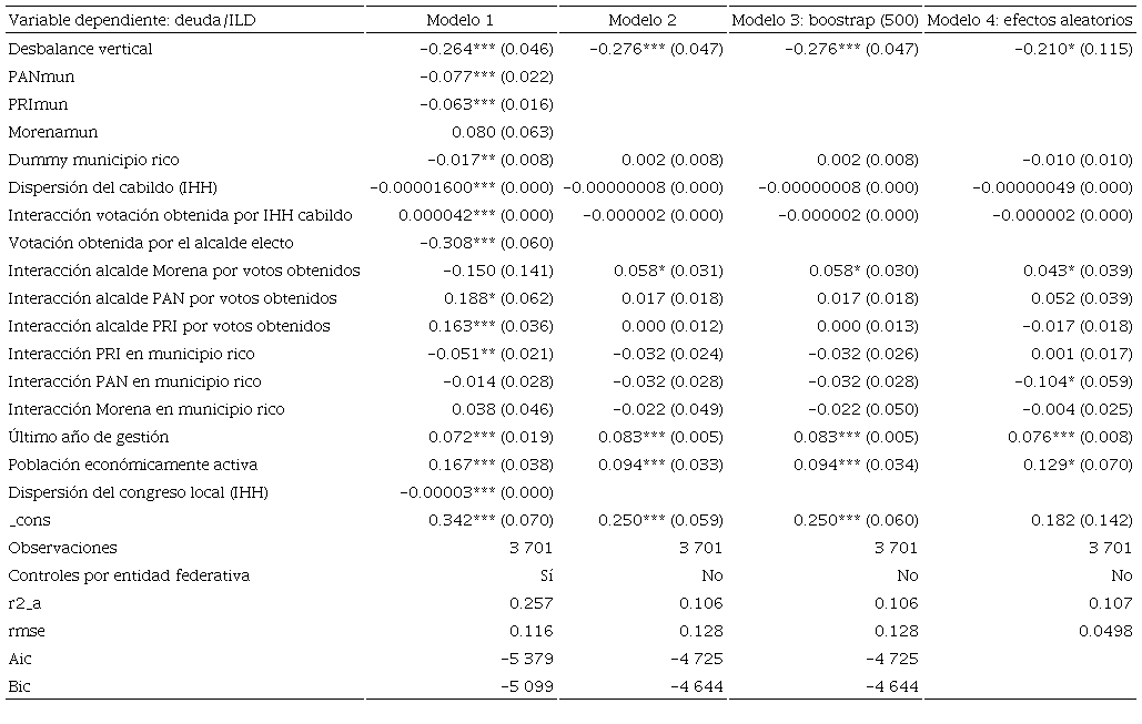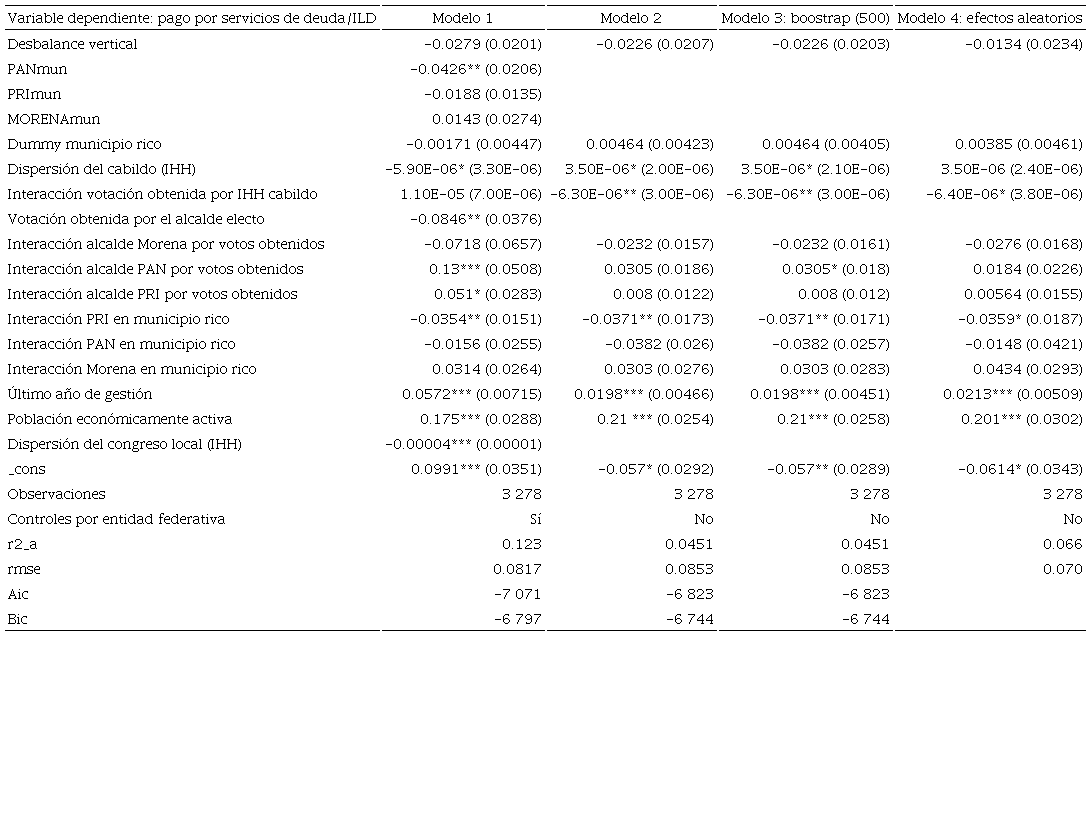 Al examinar el caso del modelo 1 (menor aic y bic) que explica la deuda sobre los ingresos de libre disposición, la interpretación de los resultados es la siguiente. Primero, se mantiene la significancia y el signo esperado en el desbalance vertical, el último año del alcalde y la PEA. Segundo, algunas variables políticas resultan significativas y con signos esperados, destacándose la disminución de la deuda en los municipios gobernados por el PAN (99 por ciento de confianza estadística), lo que se revierte una vez que dicha variable interactúa con el porcentaje de votación obtenido del alcalde (90 por ciento de confianza estadística). Para el caso de los municipios gobernados por el PRI sucede algo similar, aunque es importante resaltar la significancia estadística y el signo positivo de la variable una vez que se consideran los municipios considerados como ricos. En cuanto a la estimación que explica el pago por servicios de la deuda, el modelo 1 da cuenta de manera generalizada y significativa que los gobiernos ricos gobernados por el PRI muestran menores valores en este indicador. En otro sentido, el último año de gestión y la PEA impactan de manera positiva y estadísticamente significativa el pago por servicios de la deuda.