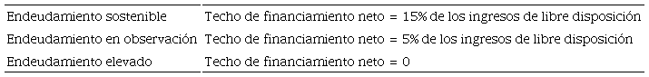 En la misma LDFEM se crea un sistema de alertas mediante el cual la SHCP realiza las evaluaciones de las obligaciones y los financiamientos contraídos por los estados y municipios, que están inscritos en un Registro Público Único. Esta evaluación trae como resultado el límite de endeudamiento para los estados y municipios, lo que permite un nivel de endeudamiento mayor a aquellos gobiernos subnacionales que estén en una categoría estable o sostenible. Su incumplimiento está sujeto a una sanción en conformidad con la legislación en materia de responsabilidades administrativas de los servidores públicos (Andrade, 2018). La medición del sistema de alertas se realiza con base en tres indicadores; la sostenibilidad de la deuda, la capacidad de pago y la disponibilidad financiera. Su cumplimiento se mide según distintos rangos que varían entre estados y municipios (cuadro A1). El nivel de cumplimiento de los indicadores se clasifica en tres tipos de endeudamiento, correspondientes a: “sostenible”, “en observación” y “elevado”. Para cada clasificación, la LDFEM asigna un techo de financiamiento neto, como se muestra en el cuadro A2.4