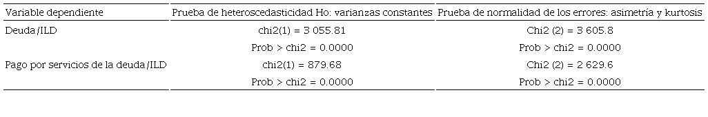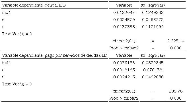 Para la obtención de los resultados, se emplearon el modelo de mínimos cuadrados ordinarios (OLS) y un modelo panel con efectos aleatorios. Sobre el modelo panel, es necesario precisar que las correlaciones, tanto del componente individual um como del componente de error Ɛmt con las variables explicativas, resultan bajas, cercanas a cero, lo que en cierta forma otorga validez al modelo de efectos aleatorios estimado. Este argumento, por cierto, se refuerza con la prueba Breusch and Pagan Lagrangian Multiplier, cuyos resultados, en los dos modelos estimados, rechazan la hipótesis nula de que los efectos aleatorios son iguales a cero (cuadro A5).