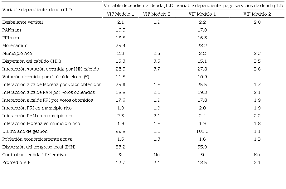 Se agrega al modelo un conjunto de variables políticas (Xpol ). Estas incluyen el porcentaje de votación que obtuvo el alcalde en la última elección, la concentración política del congreso local y del cabildo municipal medida a través del índice de Herfindahl-Hirschman (IHH), el partido al que pertenece el alcalde según las tres principales fuerzas políticas del país durante los años de análisis: Morena, PAN, PRI. Aunado a ello, se mide el año electoral, a través de una variable dicotómica que denota si es el último año de gestión del alcalde. También se incluyen variables de control, las cuales son dicotómicas por cada entidad federativa. Se incluye en la ecuación una serie de interacciones entre la votación obtenida, el IHH del cabildo, el partido del alcalde, y si el municipio cuenta con un nivel de ingresos per cápita alto (municipio rico).