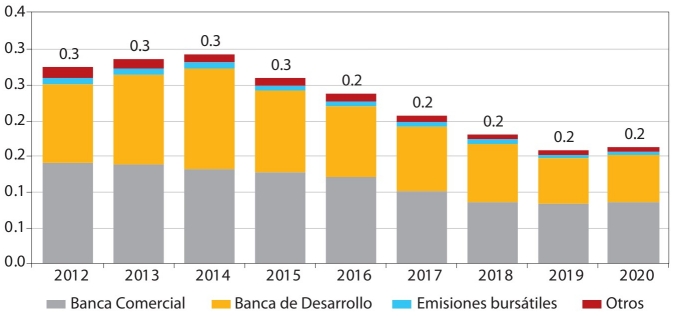 En la última década (2012-2020), la deuda agregada de los municipios promedió 0.2 por ciento del PIB (gráfica 1), monto que se ha conformado principalmente por 49 por ciento de créditos con la banca comercial, 43.4 por ciento de créditos con la banca de desarrollo, 3 por ciento de emisiones bursátiles, y el restante 4.6 por ciento de fideicomisos y otros instrumentos de deuda. Durante el periodo bajo estudio, es posible observar una disminución en el agregado de la deuda municipal a partir de 2015, lo cual puede explicarse, en parte, como respuesta a la implementación de la LDFEM, a través de las reglas más estrictas para la contratación de financiamientos y obligaciones, así como, de forma más específica, fruto de aumentos en el costo de la deuda, principalmente a través de la tasa de interés. Los préstamos de la banca comercial, por lo general, son a corto plazo y se utilizan para cubrir el déficit fiscal ocasionado por los gastos de funcionamiento. Suelen ser competitivos debido a la facilidad en los requisitos de capitalización bancaria, los cuales están centrados en dos calificaciones crediticias; sin embargo, los intereses suelen ser elevados, tal como se señala más adelante. Los préstamos de la banca de desarrollo, por otro lado, provienen principalmente del Banco Nacional de Obras y Servicios (Banobras), que es propiedad del gobierno federal, y su objetivo es fomentar la inversión en infraestructura pública. Se considera que estos préstamos son los más caros del mercado, debido principalmente a los altos costos de transacción, entre los que destacan la autorización del Congreso local, la constancia de mayoría del cabildo del municipio y la presentación de un plan de inversión preliminar (Banobras, 2020). Finalmente, las emisiones de bonos suelen proporcionar un financiamiento más efectivo y eficiente en costos, sobre todo si el gobierno municipal es solvente. Si este no fuera el caso, las instituciones financieras y los inversionistas suelen exigir tasas de interés más altas, así como términos y condiciones más estrictos (Smith, 2018).
