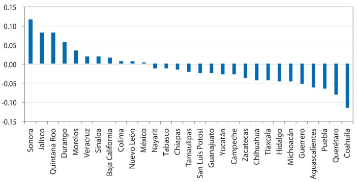 Resulta interesante analizar los valores esperados obtenidos en promedio para cada entidad federativa. En este sentido, se utilizaron los coeficientes resultantes del cociente entre el saldo de la deuda y los ingresos de libre disposición, y se encontraron, en efecto, pocas discrepancias, y de baja magnitud, entre los valores efectivos observados durante el periodo 2017-2019 y los valores esperados de la regresión (gráfica 2). Las discrepancias dan cuenta, por cierto, de factores no observables, como emergencias que obligan a gastos no previstos, otras condiciones socioeconómicas que restringen el acceso a deuda o legislaciones locales difíciles de integrar en las variables exógenas. Un claro ejemplo de lo anterior es el estado de Tlaxcala, en donde el cociente observado es de apenas 0.4 por ciento, cifra menor al valor estimado en nuestro modelo, y que encuentra explicación en la legislación local que restringe el tope de endeudamiento de los municipios en 15 por ciento de su presupuesto correspondiente (Constitución Política del Estado Libre y Soberano de Tlaxcala, 1918). Por el lado de los mayores niveles, destacan Sonora, Jalisco y Quintana Roo, estados en los que gran parte de su deuda municipal se concentra en ciudades importantes, como Hermosillo y Nogales (Sonora); Guadalajara, Tonalá y Zapopan (Jalisco); y Cozumel (Quintana Roo). En este sentido, se debe resaltar el alto nivel de concentración de la deuda que existe a nivel municipal en México, toda vez que casi una cuarta parte de la deuda agregada se concentra tan solo en cinco municipios (CEFP, 2020). Esto se debe, en parte, a que aún existen muchos municipios que no han desarrollado las capacidades administrativas para contratar deuda, lo que claramente se revela en una gran asimetría en el acceso a financiamientos entre los municipios rurales y urbanos del país (IMCO, 2021).