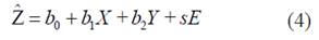 Donde E es un valor seleccionado aleatoriamente de una distribución normal estándar (con media cero y desviación estándar 1) y s es la desviación estándar estimada del error en la regresión (en este caso la media cuadrática del error). Al añadir esta selección aleatoria, la varianza de los valores sustituidos incrementa y previene los sesgos causados usualmente por el método convencional de imputación (Allison, 2001).