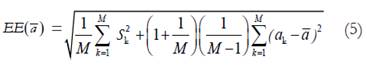 En la anterior formula, M es el número de bases de datos generados, Sk es el error estándar en késima base de datos, sería la estimación del parámetro en la kakésima base de datos, y a es la media de los parámetros estimados y el factor (1+1/M) corrige la ecuación debido a que el número de bases de datos es finito.