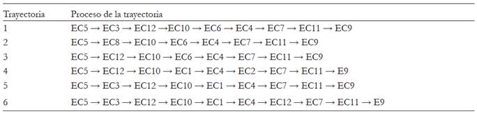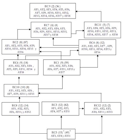 Con los conglomerados ya formulados, es posible establecer redes de estados de conocimiento, como se muestra en la Figura 1 y elaborar trayectorias de aprendizaje conformadas por cadenas de estados de conocimiento. Las trayectorias de aprendizaje permiten definir la manera en que se puede ir mejorando progresivamente en el dominio de habilidades. Algunas de ellas se muestran en la Tabla 5. Las trayectorias de aprendizaje mostradas anteriormente inician en EC5, lo cual implica que los tres atributos asociados con dicho estado conglomerado de conocimiento fueron dominados por casi todas las personas. Tales atributos son: simplificación de expresiones (AT3), resolución de ecuaciones o desigualdades (AT4) y utilización de fórmulas (AT11).