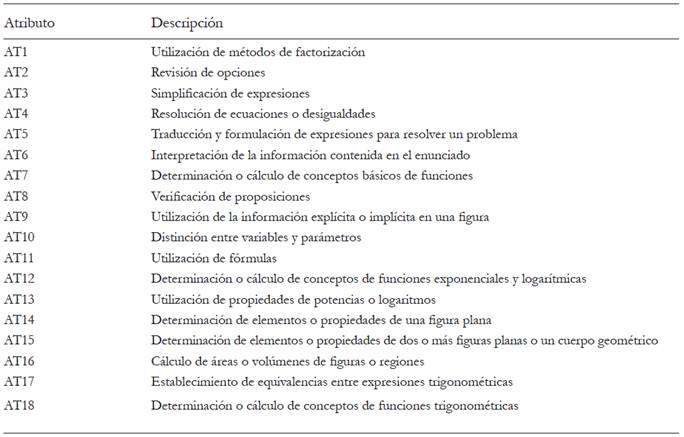 En la tabla 1 se describen los atributos correspondientes a los ítems de la prueba en estudio, que fueron codifi cados y con ello se formuló la matriz Q.