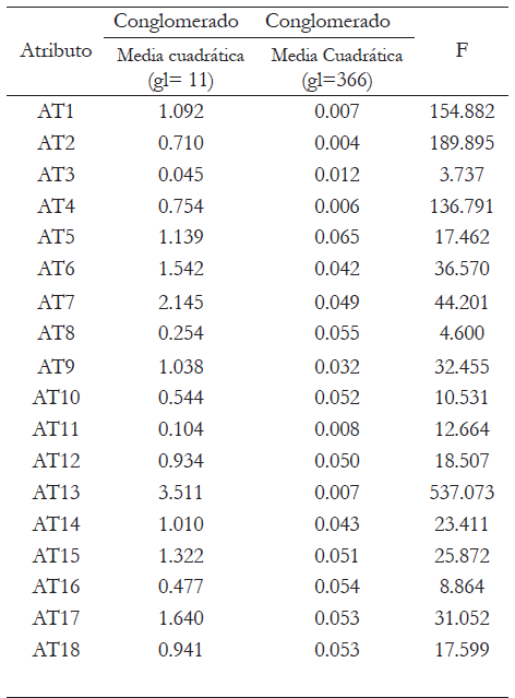 Los resultados presentados en la Tabla 2 muestran que los valores de F varían desde 3.737 hasta 537.073, esto denota que cada atributo es de utilidad para la separación en estados conglomerados de conocimiento. Por tanto, la escogencia de doce conglomerados se considera una solución interpretable en términos cognitivos.