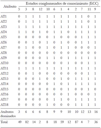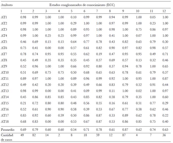 Para efectos de interpretaciones con mayor significado educativo, cada uno de los vectores de probabilidad de dominio de atributos de cada conglomerado se transformó en un vector binario, en el que los unos indican el dominio del atributo correspondiente y los ceros, el caso contrario. Con esto se logra un patrón de dominio de atributos para cada estado conglomerado de conocimiento. Se utilizó 0.75 como punto de corte para estas transformaciones.