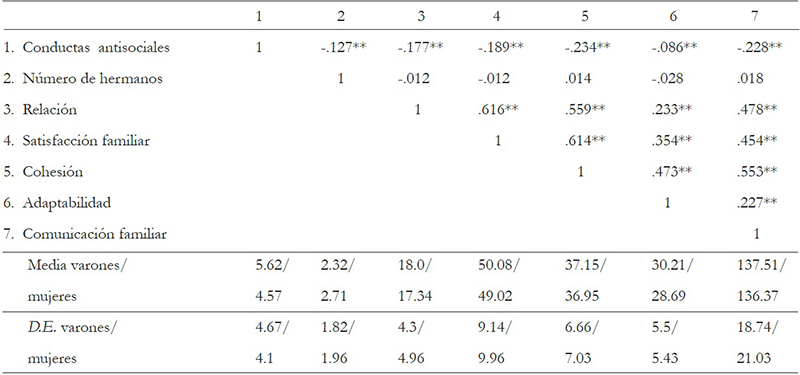 Las correlaciones entre las variables de estudio, así como el análisis descriptivo de dichas variables según el sexo de los evaluados, se pueden apreciar en la Tabla 1. La mayoría de dichas correlaciones son significativas y en la dirección esperada, aunque de baja intensidad en lo que respecta a las conductas antisociales.