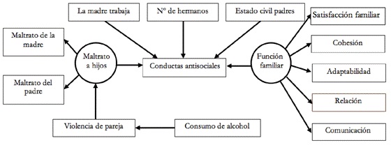 Abstract: The aim was to determine the influence of the family on antisocial behavior in non-institutionalized adolescents. The sample consisted of 929 high school students, between 14 and 17 years old. In the process, a battery of test about social-demographic data, antisocial behavior and family functioning: relationship, satisfaction, cohesion, adaptability and family communication was applied. We analyzed variables using structural equation models differentiated by sex. The results indicated that family functioning in both sexes and the number of siblings in males are considerable factors when discussing antisocial behavior. The risk factors are: child abuse and violence between parents in females, besides consumption of alcohol by parents in both sexes.