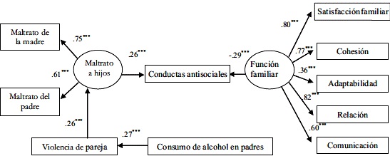 Luego de reespecificar el modelo inicial, los índices de ajuste para el modelo final de las mujeres fueron adecuados (ver Figura 2). De acuerdo con este modelo, un adecuado funcionamiento familiar - caracterizado por miembros de la familia satisfechos, que mantienen buenas relaciones entre sí, que se hallan unidos, se adaptan a los cambios que se van presentando y tienen una buena comunicación - ejerce un efecto protector frente a las conductas antisociales de las hijas adolescentes (λ= -.29, p < .001). Por el contrario, una familia en la que existe el maltrato hacia las hijas por parte de los padres, principalmente de la madre, incrementa la probabilidad de que las adolescentes presenten conductas antisociales como respuesta o desfogue a esta situación (λ=.26, p < .001). Otro punto importante a considerar es que el maltrato hacia las hijas se ve influido, a su vez, por la violencia de pareja entre los padres (λ=.26, p < .001) y el consumo de alcohol por parte de alguno de sus progenitores (λ = .27, p < .001).