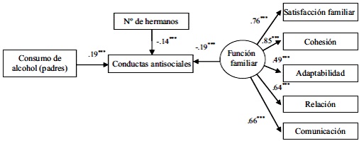 Para el caso del modelo reespecificado en los varones (ver Figura 3), encontramos que al igual que en el modelo estructural de las mujeres, un adecuado funcionamiento familiar genera un efecto protector contra las conductas antisociales en los adolescentes varones (λ=-.19; p < .001), así como tener una mayor cantidad de hermanos (λ=-.14; p < .001). Por otro lado, el consumo de alcohol por parte de alguno o ambos padres incrementa la probabilidad de conductas antisociales en los hijos (λ=.19; p < .001).