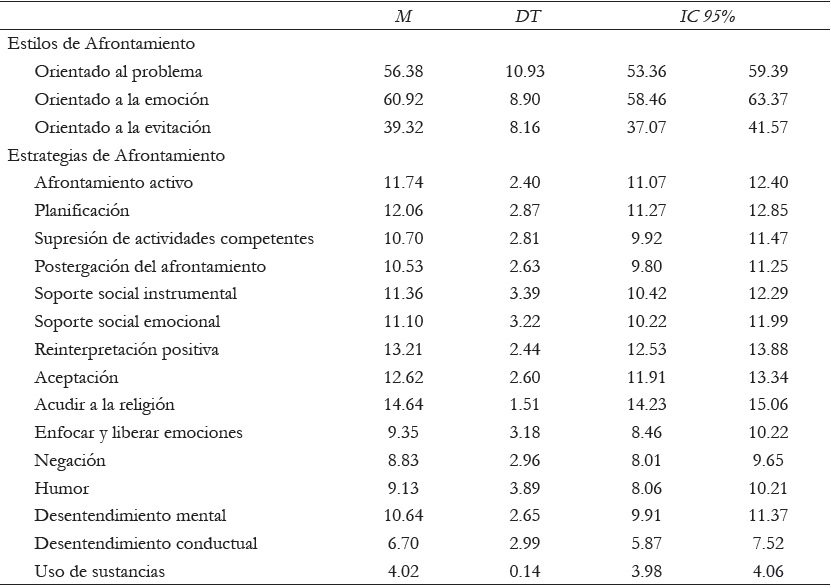 En el presente estudio, se encontró que la estructura de 3 estilos era la pertinente y se encontraron puntajes alfa de Cronbach de .86, .81 y .75 para los mismos (orientado al problema, orientado a la emoción y evitativo, respectivamente). Las puntuaciones para las estrategias fluctuaron entre .56 y .85, aunque las escalas afrontamiento religioso y uso de alcohol/ drogas presentaron indicadores bajos (.23 y .00, respectivamente). Estas dos últimas se justifican debido a que casi la totalidad de participantes respondieron que usan con mucha frecuencia la religión, mientras que casi nunca usan alcohol o drogas como forma de afrontamiento al estrés. Comprendiendo ambas estrategias en el contexto de una enfermedad, se mantuvieron dichas escalas.