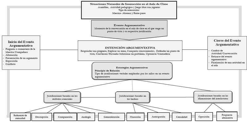 Se empleó una bitácora de observación de los eventos argumentativos en la que se registró: (1) el tipo de interacción: maestro-alumno o entre pares; (2) el inicio de evento argumentativo: turno conversacional específico de la conversación que antecede a que un niño presente una estrategia argumentativa; (3) la intención argumentativa: propósito que persigue el niño cuando emplea una determinada estrategia; (4) las estrategias argumentativas: tipo de justificaciones verbales que emplea un niño como evidencia de su punto de vista; y (5) el cierre del evento argumentativo: turno conversacional por medio del cual se concluye el evento argumentativo. La bitácora se complementó con el registro de grabación de las situaciones naturales de interacción en el aula de clase y las notas de campo.
