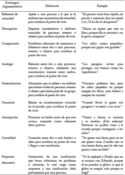 Las observaciones y valoraciones cualitativas de los seis jueces fueron incorporadas al proceso de categorización de este estudio. El resultado final de este proceso de confirmabilidad fue la obtención de diez categorías de estrategias argumentativas verbales empleadas por lo niños participantes para justificar sus puntos de vista: referente de autoridad, descripción, comparación, analogía, generalización, narración, anticipación, causalidad, oposición y propuesta alternativa. La tabla 1 muestra la descripción de cada una de las estrategias, su definición y los ejemplos que fueron extraídos de los eventos argumentativos documentados en este estudio.
