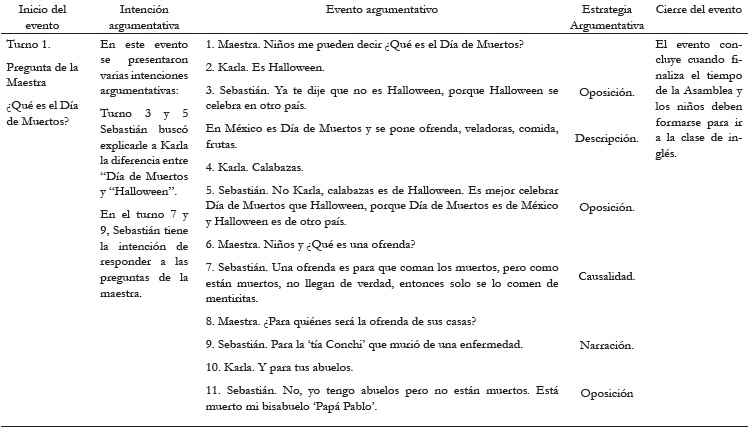 En este evento surgieron cuatro tipos de estrategias argumentativas: oposición, descripción, causalidad y narración. En el turno conversacional 3, Sebastián utiliza la estrategia de oposición para expresar su desacuerdo con la afirmación que realiza Karla, ya que para él existe una diferencia entre “Día de Muertos” y “Halloween”. Esta diferencia la explica empleando la estrategia de descripción, en la que expresó las siguientes características representativas del “Día de Muertos”: ofrendas, veladoras, comida y frutas.