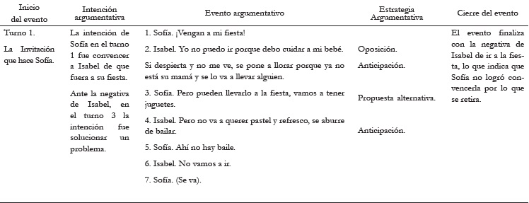 En este evento, se presentaron tres tipos de estrategias argumentativas: oposición, anticipación y propuesta alternativa. La estrategia de oposición apareció en el turno conversacional 2, ante la negativa de Isabel de ir a la fiesta, quien además anticipa lo que sucedería sí el bebé se despierta y ella no está. Frente a lo expuesto por su compañera, Sofía presentó en el turno 3 la estrategia de propuesta alternativa, señalando una posible solución al problema: “Pero pueden llevarlo a la fiesta, vamos a tener juguetes”.