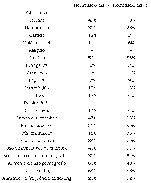 Os dados sociodemográficos apresentam algumas características que diferenciam os intragrupos. Como a quantidade de homens gays que estão solteiros (68%) e casados (3%), enquanto os homens heterossexuais, 47% e 12%, respectivamente. As religiões não apresentaram diversificações relevantes. Quanto à escolaridade, a maioria dos homens gays possuem ensino superior (66%) e os heterossexuais 61% possuem o ensino médio, mas com 47% cursando o ensino superior. Ambos os grupos possuem dados que sobressaem quanto a vida sexual ativa, uso de pornografia e prática de sexting.