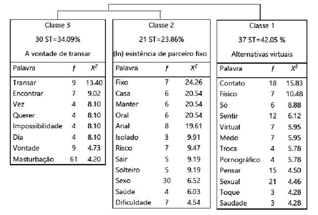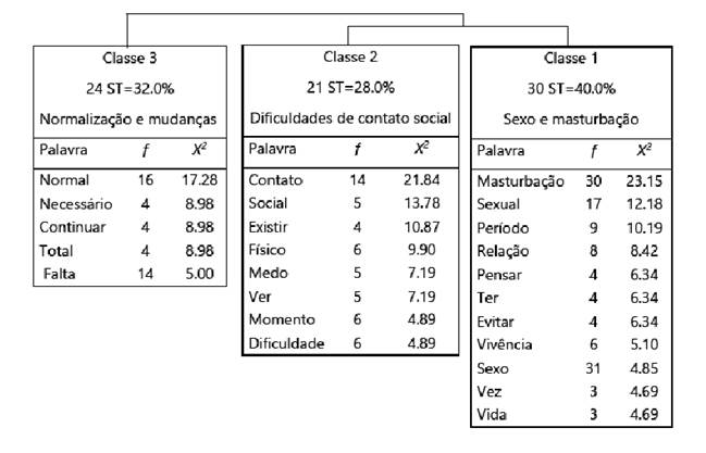 Na Figura 1, visualiza-se a divisão das classes. A classe 1, apresentou representações sociais direcionadas às vivências sexuais e masturbação; a classe 2 exibe as dificuldades advindas com o período de isolamento social; e a classe 3, a normalização das mudanças na vida sexual devido ao período de isolamento social.