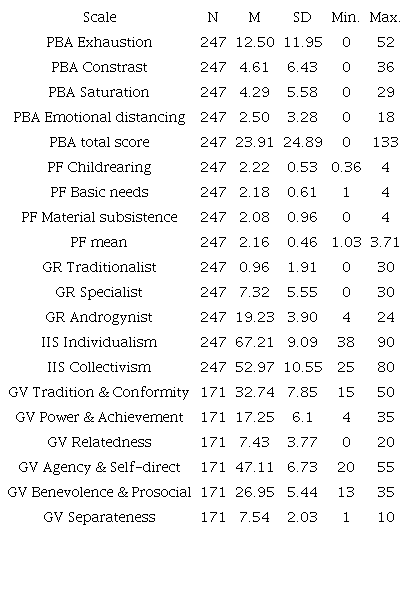 As it can be seen in the table above, most parents have an average level of individualism. As mentioned previously, it is important to consider these scores in conjunction with the family type, and not as separate variables, since they showed an interaction effect on the parental burnout score. However, considering that most of the sample does not meet the parental burnout diagnostic condition, it is also relevant to interpret these results cautiously.