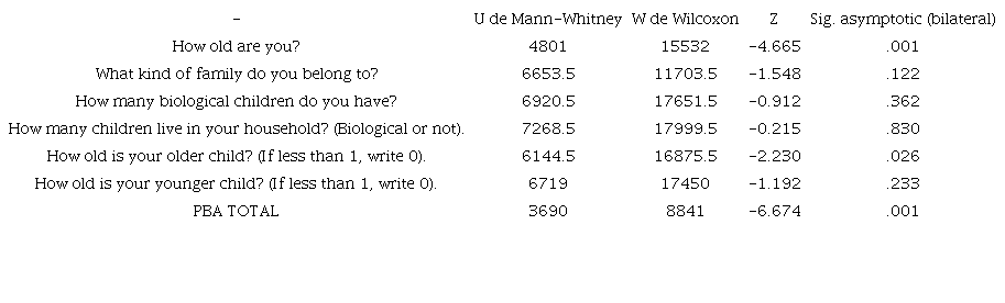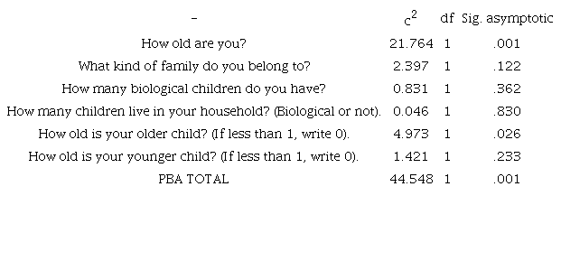 The significant differences appear to be between being a mother or a father and age, that is, between being a mother or a father and the age of the older child, but most importantly between being a mother or a father and the score in PBA. Thus, gender roles emerge as possible stressors or predictive variables.