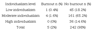 Finally, according to the mean as well as to the standard deviation, cut-off points were established to determine the low, medium, and high level of individualism. Considering the level of individualism of the parents, the following table shows the percentages according to their exhaustion/not exhaustion condition (Table 4).