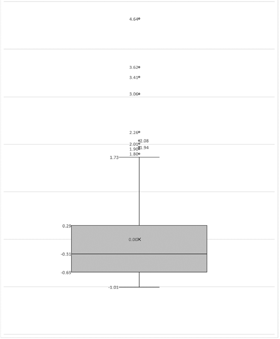 It is useful to mention that the quartile 3 = .29, i. e., 25% of the sample, is at least .20 standard deviations above the media. On the other hand, percentile 90 = 1.63, i. e., at least 10% of the sample is 1.63 standard deviations from the media. Finally, the value of the upper whisker is 1.73 and it shows a noticeable number of participants that score above this last value.
