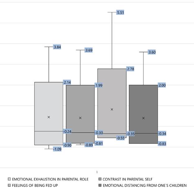 The dots above the media (x) but especially those above the upper whiskers (outliers) point to the participants whose scores could be considered for further research as paradigmatic cases of how parental burnout might come about in the Costa Rican familial context.