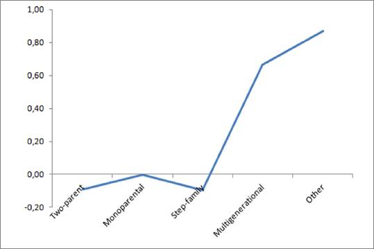 Considering the type of family, it was found that 74.8% correspond to two-parent families, 6.9% to single-parent families, 7.7% to stepfamilies, 7.3% to multigenerational families and 3.2% to other types of family structures. Families represented by a single participant of the sample were excluded from subsequent analyses.