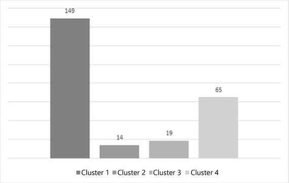 The distribution of the sample suggests that the parental burnout cut-off could be moved downwards in the Costa Rican sample with respect to the original established by Roskam. Cluster 1 contains 60% of the sample (149 participants), Cluster 2 the 6% (14 participants), Cluster 3 the 8% (19 participants), and Cluster 4 the 26% (65 participants). If Cluster 2 and 3 are considered as those with a higher incidence of parental burnout, it sums up to 14% of the sample (33 participants). In Cluster 2, all the participants scored above 1.5 standard deviations up to 4.9 standard deviations in each subscale, whereas in Cluster 3 the picture looks quite similar but with few (4) participants scoring below 1 standard deviation in subscale 4: Emotional distancing from one´s children (Figure 6).