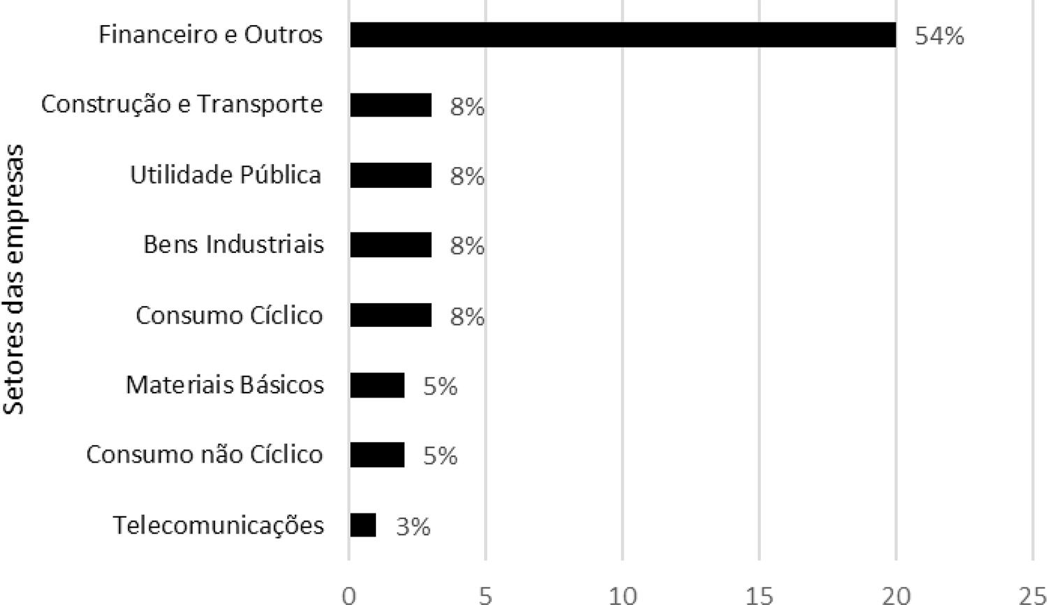 A proporção de empresas por setor pode ser observada no Gráfico 1. Destaca-se que a maior parte das empresas, no total de 20, são do setor de financeiro e outros. Os investimentos no setor financeiro nos três anos de análise foram em média de aproximadamente 1,7 bilhões de reais, maior investimento médio entre os setores.