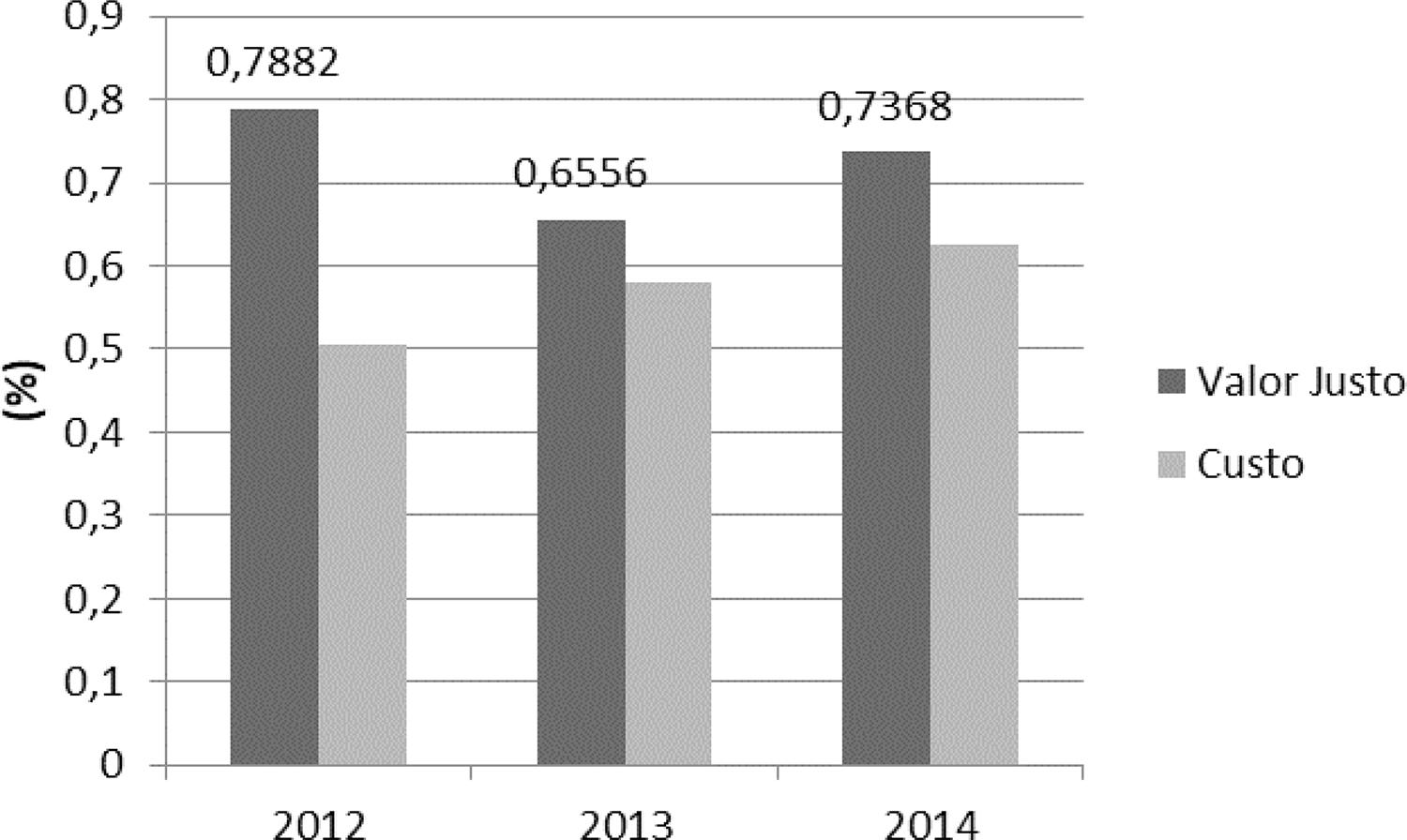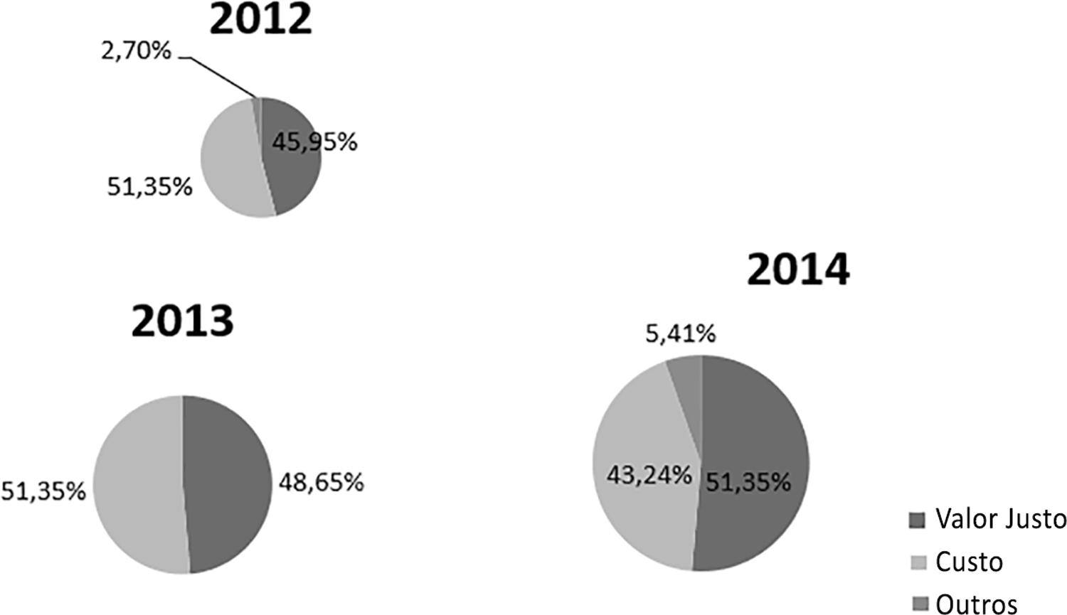 Quanto ao método de mensuração, observou-se que entre 2012 e 2014 aumentou o número de empresas que optaram pelo método do valor justo (Gráfico 2). Salienta-se que as empresas Bovespa, Bandeirante Energia e Escelsa não divulgaram esse item no período de 2012 e 2014, respectivamente, sendo as duas últimas relacionadas ao exercício de 2014. Esse ponto foi evidenciado, porque a determinação do método de mensuração das propriedades para investimento é um item relevante na avaliação do ativo.