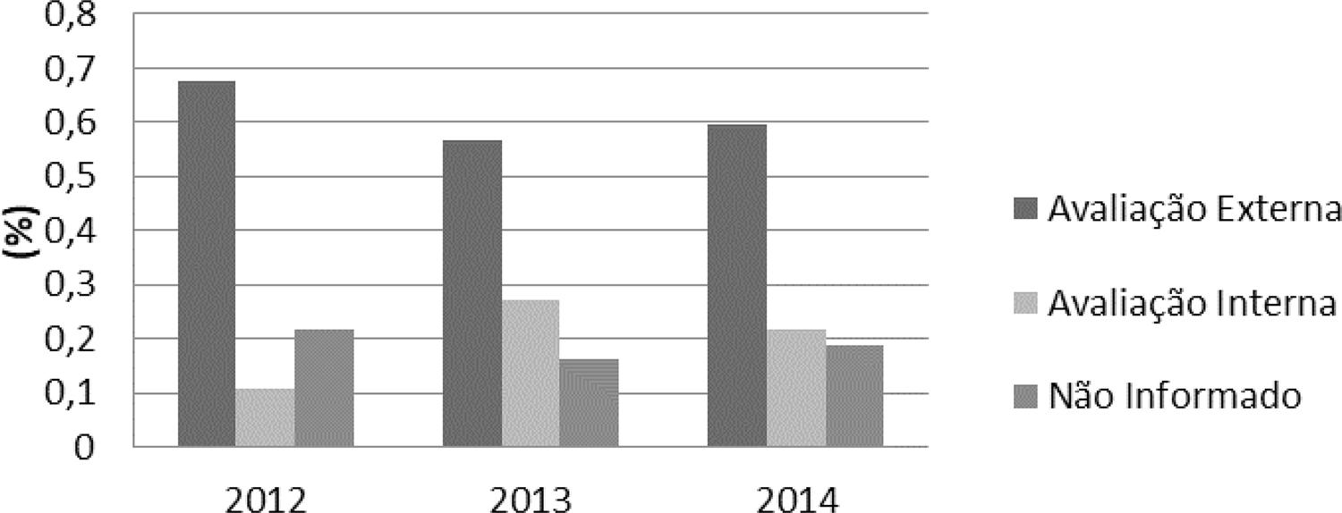 Das 37 empresas, observa-se que houve uma redução de 2012 a 2014 das empresas que usaram avaliador externo. Percebe-se com este fato um aumento da avaliação interna acompanhado de um incremento da divulgação do item (Gráfico 4).