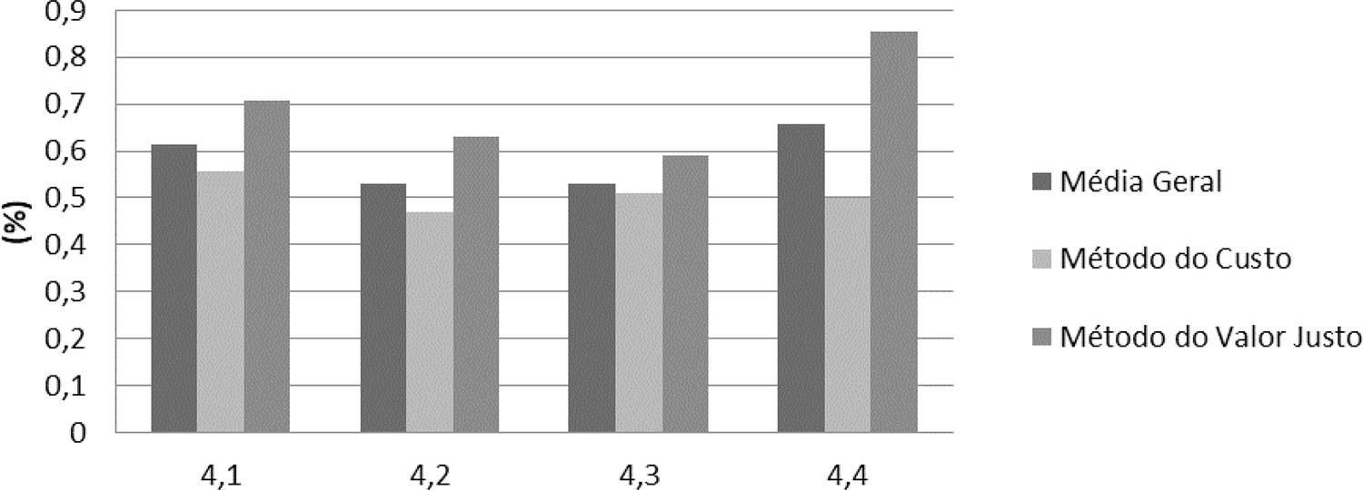 Observou-se que a média de divulgação dos itens 4.1, 4.2, 4.3 e 4.4, aos quais se referem respectivamente ao reconhecimento no resultado da receita auferida com as propriedades para investimento, dos gastos operacionais provenientes das propriedades para investimento que geraram renda, dos gastos operacionais provenientes das propriedades para investimento que não geraram renda e da alteração cumulativa do valor justo com a venda de propriedades para investimento é mais alta entre as empresas que optam por mensurar suas propriedades para investimento pelo valor justo quando comparado às empresas que optam pelo custo; esta que se comparada à média geral, das 37 empresas, é inferior como pode-se ver no Gráfico 5.