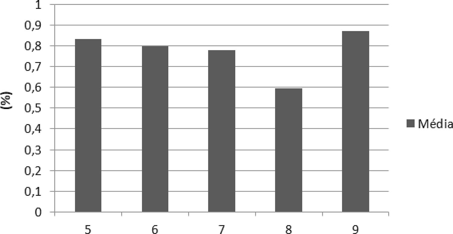 Quanto à divulgação dos itens do bloco 2, exigidos das empresas que escolhem mensurar suas propriedades para investimento pelo método do custo, pode-se observar no Gráfico 6 que a média de divulgação no período de 2012, 2013 e 2014 dos itens não foi significativamente diferente. Destaca-se que o item 8 (Observar se houve perda por impairment) teve uma divulgação menor em relação aos outros itens do bloco, o que pode trazer distorções na mensuração e avaliação do ativo.