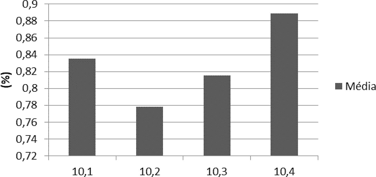 Verifica-se também a média de divulgação dos três anos em relação a cada item do bloco (Gráfico 8). Ficou demonstrado que o item 10.4 ao qual se refere a ganhos ou perdas referentes a ajustes do valor justo possui uma média de divulgação maior entre os quatro itens analisados, em que foram observados sempre ganhos que se entendem como uma valorização das propriedades para investimento. O item com a menor média de divulgação foi o 10.2 ao qual se refere a adições resultantes de aquisições por intermédio de combinação de negócios.