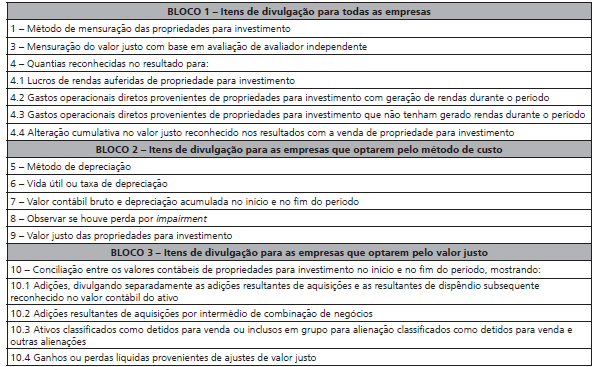4.5. Divulgação dos itens do bloco 2 para as empresas que optaram pelo método de custo para mensurar suas propriedades para investimentos