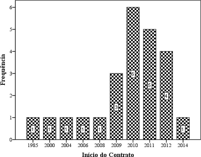 Adicionalmente, observou-se que as parcerias da amostra são recentes. O início dos contratos entre a empresa focal e as parceiras ocorre, em maioria, a partir de 2009, conforme ilustra a Figura 2.