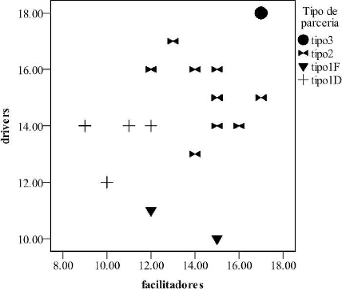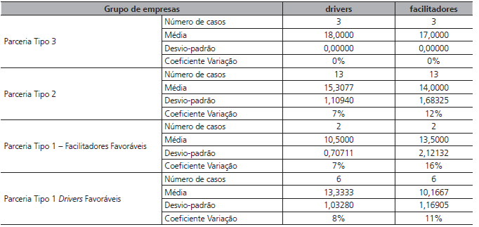 Os demais grupos representam parcerias do Tipo 1. Um grupo de duas empresas apresentou parcerias do Tipo 1, o menos desenvolvido entre os três tipos, porém com facilitadores mais favoráveis do que os drivers, o que pode ter ocorrido porque os drivers tendem a manter os agentes em posições distantes, com baixa propensão à parceria. Todavia, há aspectos no ambiente organizacional, por exemplo, cultura organizacional e sistemas de gestão semelhantes, que impelem à formação de parcerias mais estreitas.