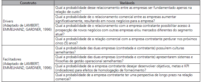O instrumento de coleta de dados, com base no estudo de Lambert, Emmelhainz e Gardner (1996), contemplou quatro facilitadores e quatro drivers para o desenvolvimento de parcerias entre fornecedores e a empresa focal, conforme expõe o Quadro 1 a seguir.