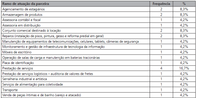 Dentre as 24 empresas (fornecedoras) estudadas apenas três exercem atividades consideradas centrais para a empresa focal (transporte, armazenagem e assessoria em distribuição), as demais empresas parceiras exercem atividades relacionadas ao negócio, porém não centrais, conforme expõe o Quadro 2.