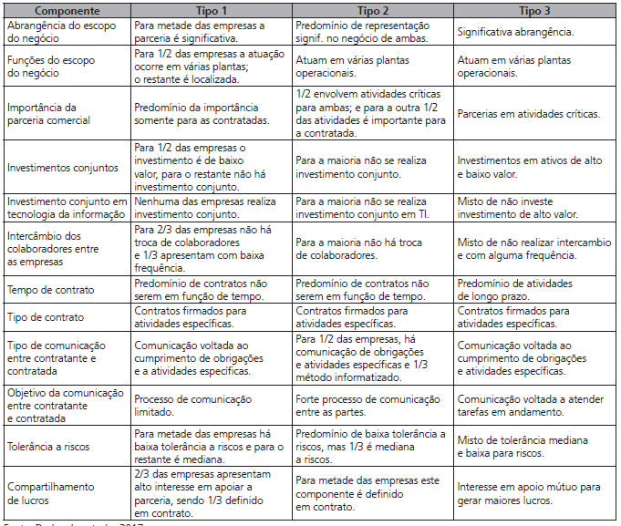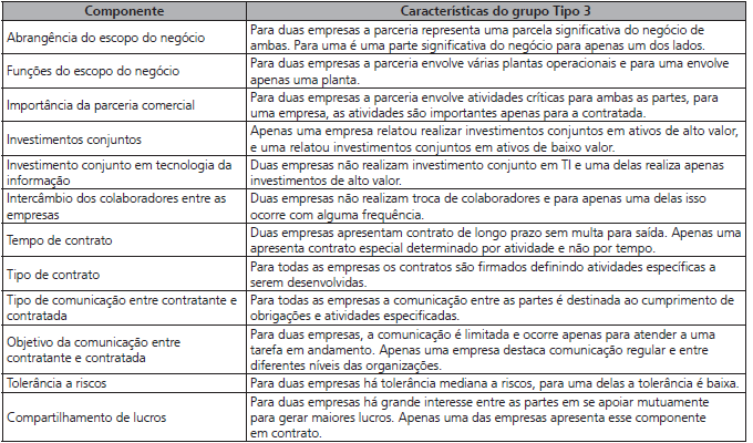 Fonte: Dados do estudo, 2017.Os componentes de parceria foram analisados para cada um dos agrupamentos, com base em tabulações cruzadas. O grupo com parcerias do Tipo 3 apresenta características coerentes com esse tipo de relação organizacional: 100% das empresas nesse grupo valorizam a proximidade física, têm intenção de atuar de forma exclusiva com o parceiro e nunca tiveram problemas com rompimento de contrato. Surpreende o fato das empresas classificadas no Tipo 3 de parceria não apresentarem da forma mais intensa a prática de investimento conjunto, intercâmbio de pessoal, comunicação entre as partes melhor desenvolvida e disseminada. O Quadro 4 apresenta uma sinopse das relações das empresas Tipo 3.