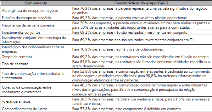 As empresas com parcerias do Tipo 2 em maioria não valorizam a proximidade física (69,2%) e nunca tiveram problemas de interrupção contratual (84,6%). No entanto, em relação à intenção de se trabalhar de forma exclusiva com o parceiro, observou-se que 53,4% dos casos possuem essa pretensão. O Quadro 5 resume as características predominantes desse agrupamento quanto aos componentes da parceria. Esse grupo apresenta empresas com processo de comunicação com as parceiras mais desenvolvido do que aqueles observados no grupo Tipo 3.