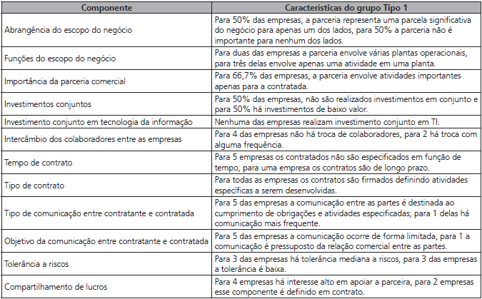 O grupo de duas empresas que apresentam parceria Tipo 1 com facilitadores mais favoráveis consideram a proximidade fundamental, não pretendem trabalhar com a parceira de forma exclusiva. Por conter apenas duas empresas, é difícil estabelecer um padrão nos componentes de parceria. Contudo, observou-se que para ambas a parceria é considerada importante apenas para a contratada, não há investimento conjunto, não há intercâmbio de pessoal, os contratos são de curto prazo, a comunicação entre as partes é limitada, há baixa tolerância a risco, características que são coerentes com parcerias desse tipo.