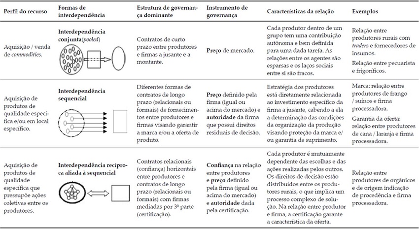 Verifica-se que, para produtos com baixa ou nenhuma especificidade de ativos (commodities), as transações ocorrem por interdependência conjunta, em que o sistema de preço se torna relevante. No caso de produtos com especificidade associada a atributos do comprador, tais como marcas de processadoras, ou a garantias de oferta pela especificidade temporal, a coordenação ocorre pela interdependência sequencial, sendo o agente a jusante o coordenador dessa cadeia, focado em padronização. Por fim, no caso de produtos cuja criação de valor depende de ações coletivas, tais como aqueles com certificação de orgânico ou com indicação geográfica, as estruturas de governança devem permitir a adequada apropriação de valor ao longo da cadeia. Para Saes e Silveira (2014), essa situação implica uma netchain com interdependência recíproca entre os produtores e coordenação de terceira parte na cadeia, pela certificadora.